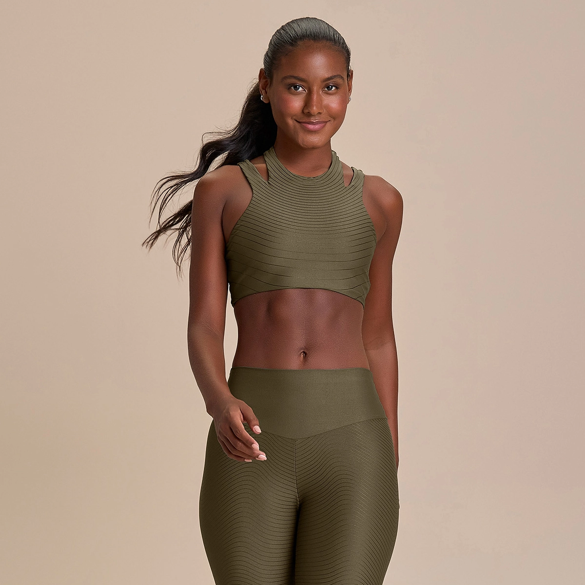 Tecido de média compressão com textura canelada e acabamento opaco, oferece ajuste firme ao corpo com zero transparência e visual sofisticado. Desenvolvido com tecnologia inclusiva LYCRA® ADAPTIV, adapta-se com conforto às formas do corpo e favorece a liberdade de movimento. Conta com proteção UV 50+, ideal para atividades ao ar livre, e tecnologia Easy Care, que facilita os cuidados diários ao reduzir a necessidade de passar. O processo de tingimento com redução no consumo de água reforça o compromisso com a sustentabilidade.