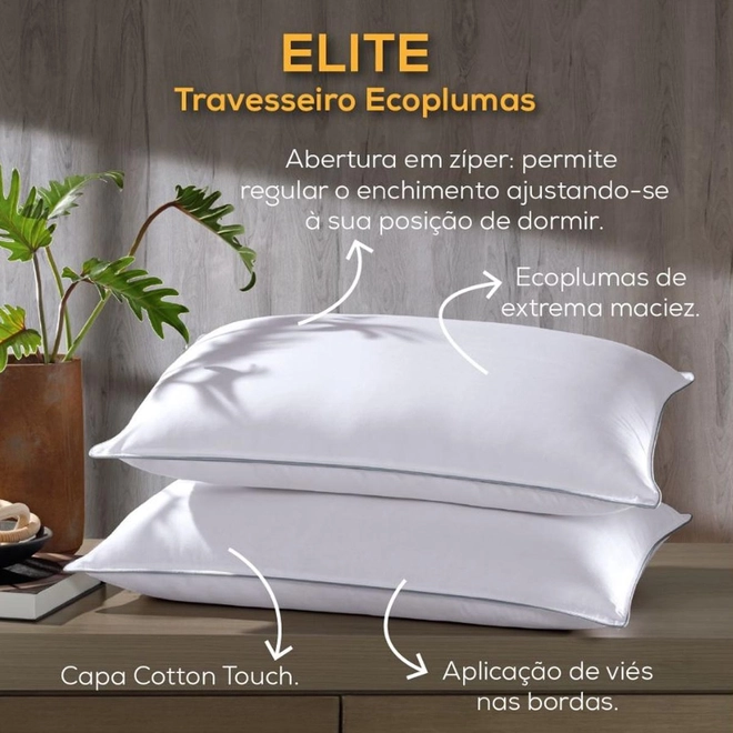 Extrema suavidade e máximo conforto: estes são os atributos do travesseiro Elite. A mais moderna tecnologia do sono traz as ecoplumas de poliéster com apelo de sustentabilidade. Mais leves e aeradas, elas destacam-se pela maciez e conforto. A capa tem tecido delicado em cotton touch e ganha a sofisticação da aplicação de soutache em toda a borda. O fechamento em zíper permite que se regule o enchimento, ajustando o travesseiro ao nível de suporte mais confortável para seu sono. Inodoro, não-alérgico e de fácil higienização, seu travesseiro Elite pode ser lavado e secado em máquina.