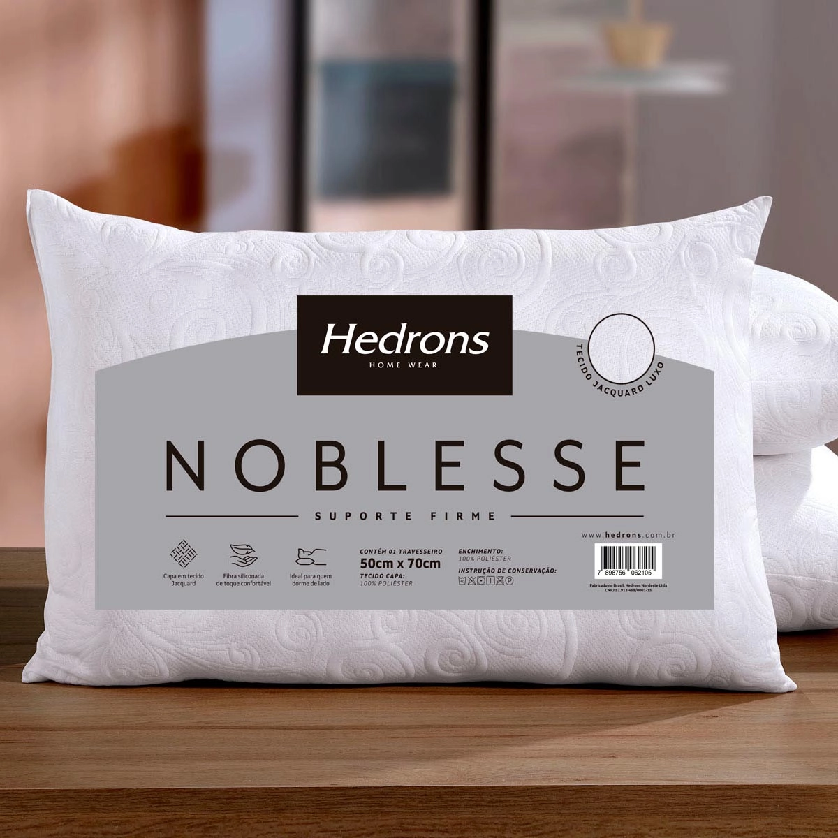 Travesseiro Noblesse Hedrons Conforto que você sente antes de deitar. Capa em malha jacquard com relevo decorativo, o mesmo tecido dos colchões mais nobres do mundo. Enchimento de 600g em fibras siliconadas que oferecem volume, suporte ideal para quem dorme de lado e facilitam a lavagem, mantendo o travesseiro sempre limpo e fresco. Medida: 50x70 cm Enchimento: 100% fibra de poliéster siliconizada Capa: malha jacquard 100% poliéster Embalagem em PVC impresso Noblesse Hedrons ? o descanso que você merece.