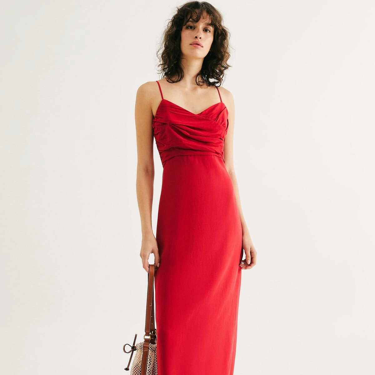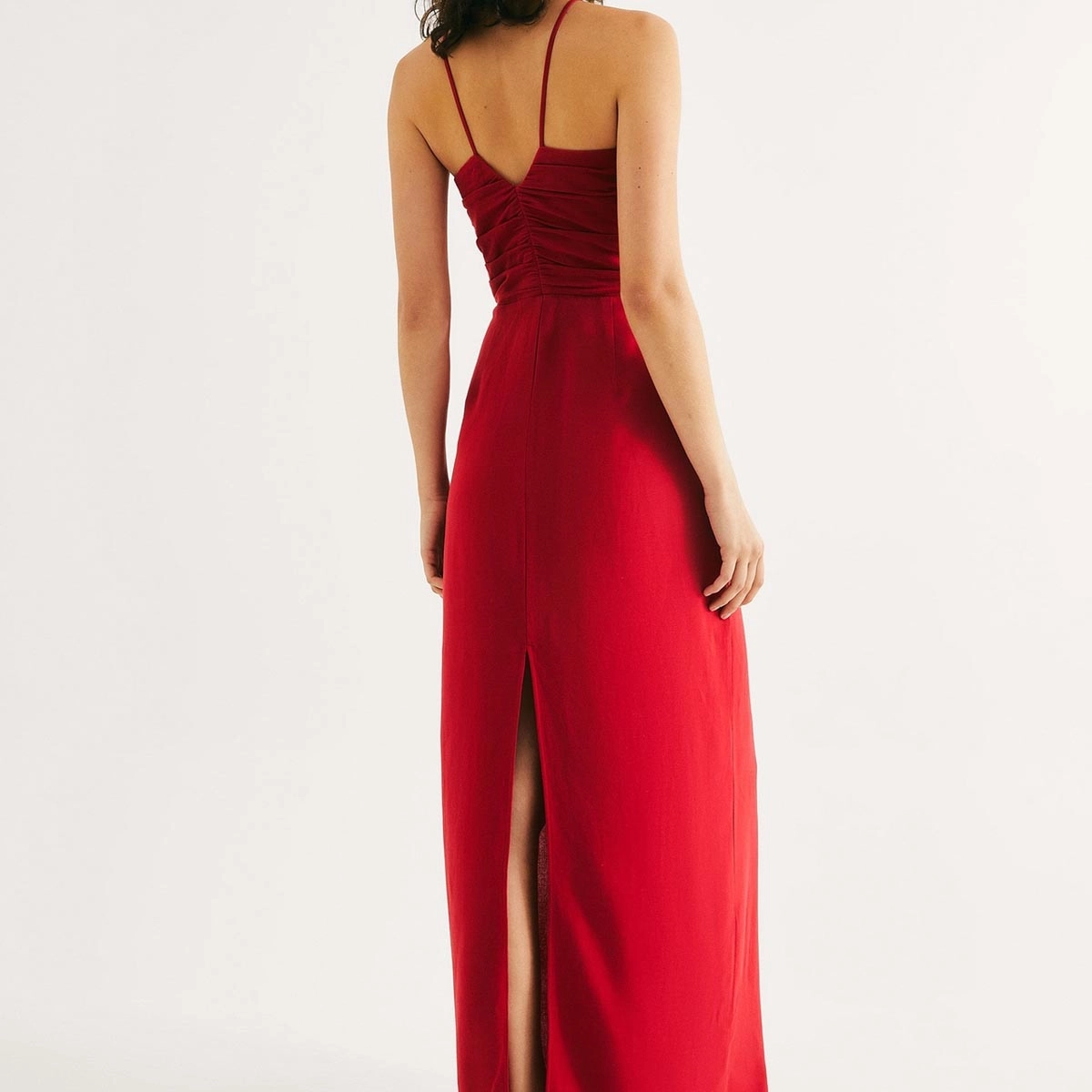 Vestido longo confeccionado em tecido leve que proporciona toque macio e caimento fluido. Possui busto drapeado e alças finas para um visual delicado e sofisticado. Conta com zíper lateral para ajuste fácil e detalhes nas costas com recorte e fenda que acrescentam charme e modernidade à peça. A modelagem com leve evasê, abrindo suavemente a partir da cintura, garantindo conforto e elegância. Forro interno para maior conforto e segurança.