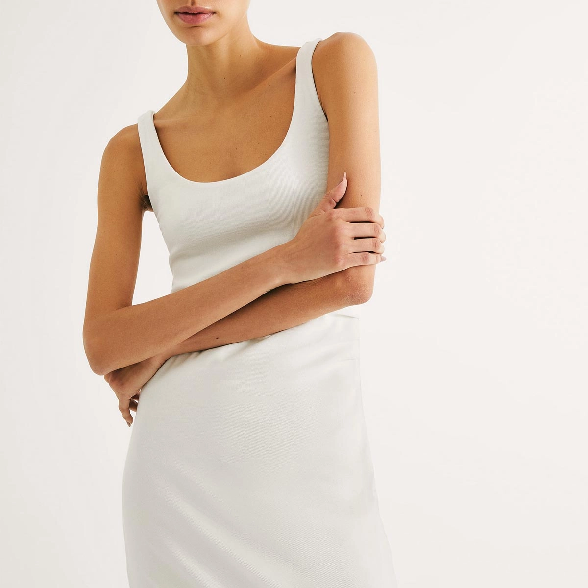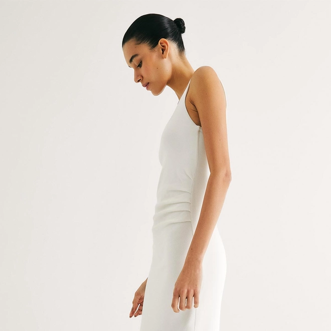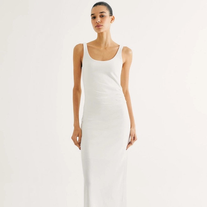 Confeccionado em ribana 2x1 canelada, o modelo possui alças largas, decote U e modelagem ajustada ao corpo, realçando as curvas com leveza. As pregas laterais adicionam um toque de charme ao visual, enquanto o forro interno no decote, em malha com elastano, garante segurança e melhor acabamento.